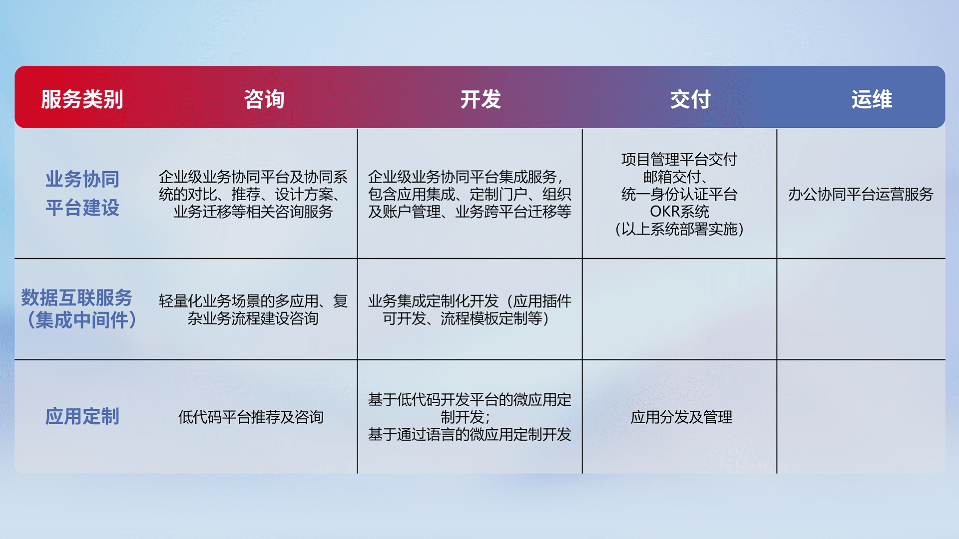 针对钉钉、、企微、、、、IDaas等平台级产品提供产品的规划、、、、方案、、、、交付、、定制化开发等服务,,实现如统一协同办公、、智能客户服务、、、、混合会议管理、、智能数据查询、、、、等业务场景,,,实现数字化转型。。